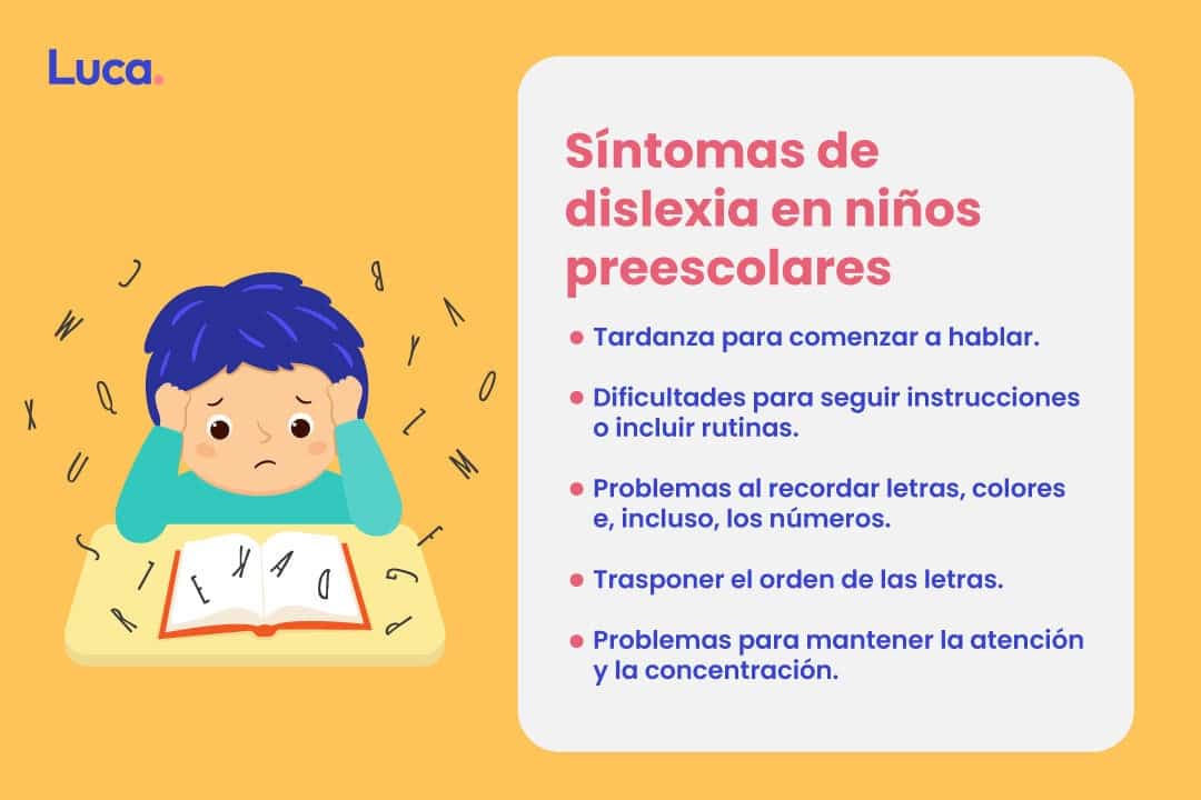 Aunque hay signos de la dislexia en niños fáciles de reconocer a lo largo de la educación en la infancia, hay otros que no lo son tanto cuando los niños no han comenzado la escuela. Al reconocer los signos, se puede evitar que el problema trascienda y se agrave cuando el niño comience a leer. Entre dichos síntomas se encuentran: