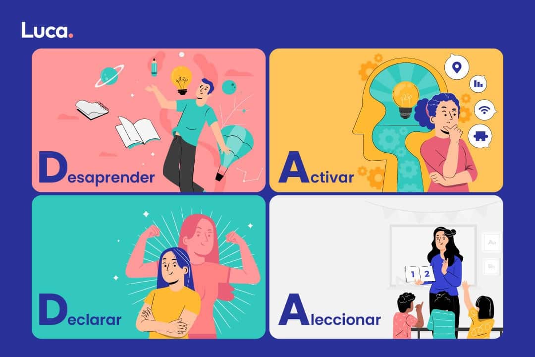 A través del método DADA se fomenta, entonces, el aprendizaje significativo, llegando a aprender, incluso, en la mitad del tiempo. Consiste en el conocimiento y puesta en práctica de 4 premisas fundamentales: Desaprender, Activar, Declarar y Aleccionar.