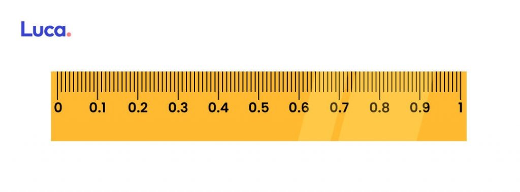Dado el caso en el que se ha dividido la unidad en 100 partes iguales y han sido ubicados los centésimos, estos se posicionarán entre el 0 y el 0,1.
