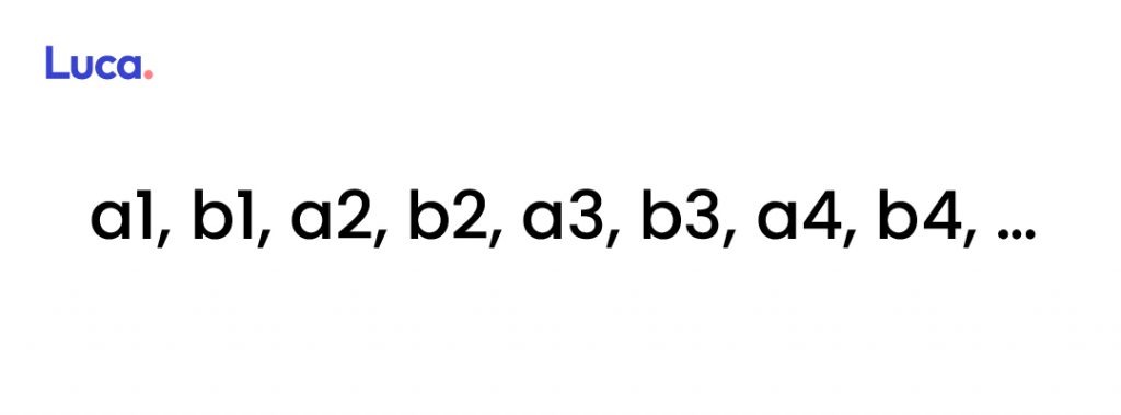 De esta manera, a1, a2, a3, a4, … constituyen los números de la primera sucesión, mientras que, b1, b2, b3, b4, … forman parte de la segunda.